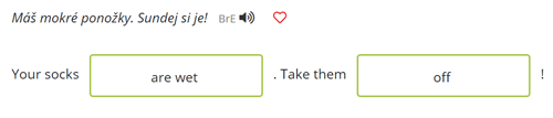 Vidíte, že je vždy zadaná věta v češtině a pod ní je anglická věta, kam uživatel zapíše – přeloží chybějící části. V tomto konkrétním příkladu chybí vždy buď jedno nebo dvě slovíčka. Správně doplněná věta by potom vypadala takto:
