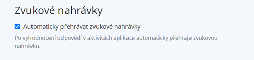 Protože víme, že při učení jazyka je potřeba mít vždy spojení psané a zvukové podoby, nahrávky přehráváme automaticky. Při zkoušení slovíček se vždy po vyhodnocení odpovědi zobrazí správná odpověď a přehraje se nahrávka. Stejně to funguje např. u testových otázek nebo textových doplňovaček. Po vyhodnocení odpovědi se vždy přehraje nahrávka celé věty.